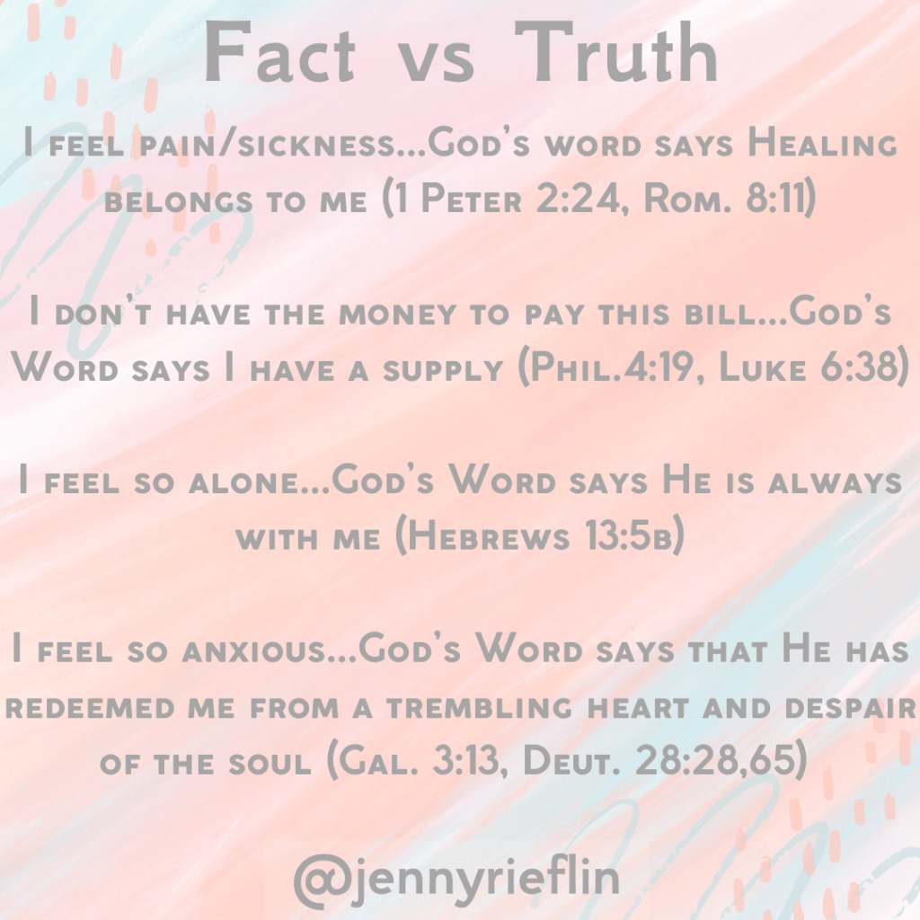 I’m not sure what you may be facing this week. You may have symptoms screaming so loudly in your body that you can’t concentrate on anything. Or you may have had a fight with your spouse or child and now feel so grieved in your heart. You may feel worried about coming up short at the end of the month when that bill is due. These are definitely FACTS in your life, to be in denial of them would be to lie, but God’s Word is ALWAYS the HIGHER TRUTH in our lives! It SUPERSEDES ANY FACTS we may be facing!