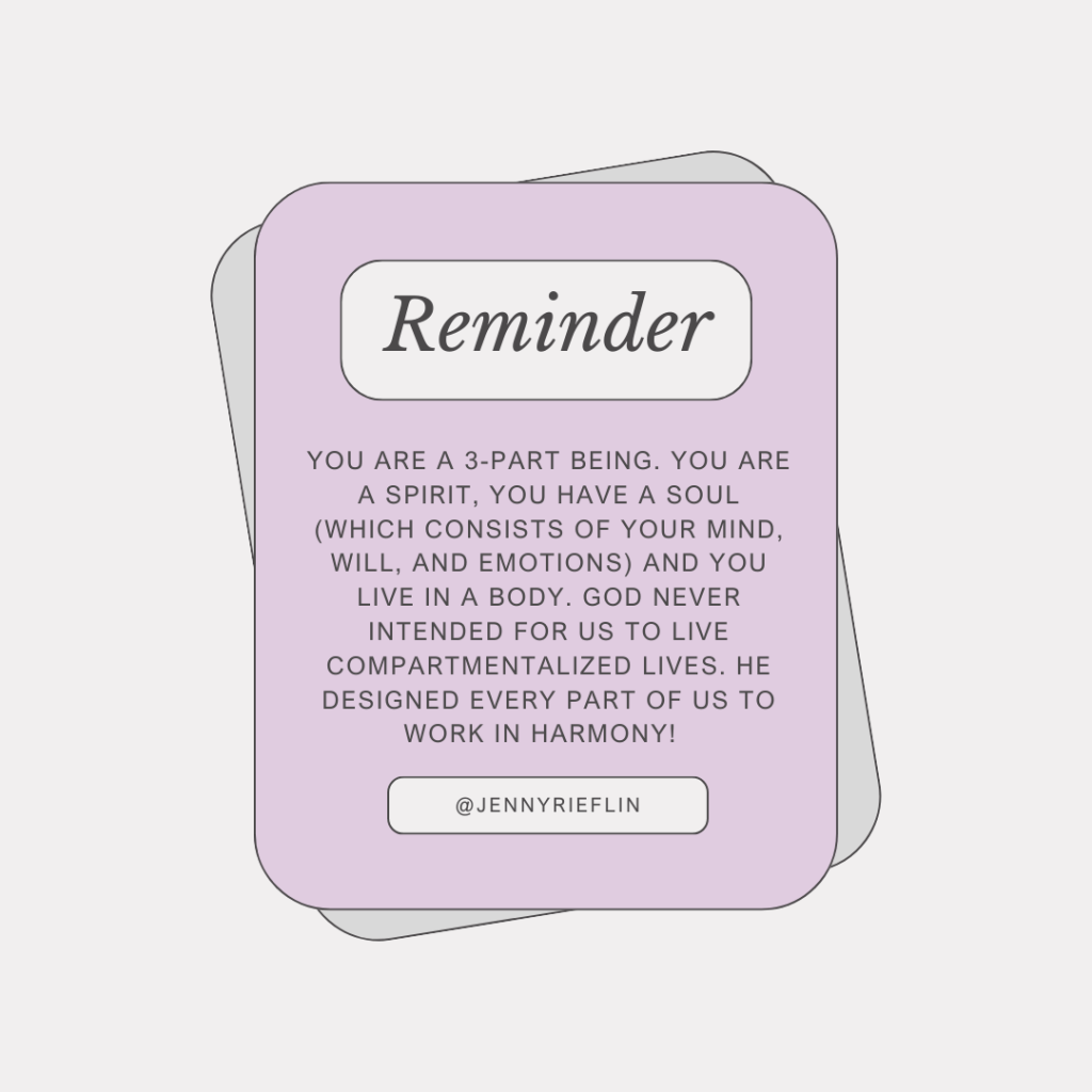 It’s important to remind ourselves that we are spirit beings, created in the same class of being as God, our Father and that we possess a soul, which is made up of our mind, our will, and our emotions, and that we live in a physical body. It’s just how we are able to interact on this earth, but it was never meant to be subservient to our truest self, our spirit.